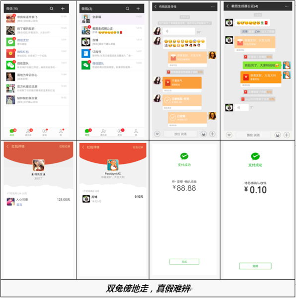 该应用制作者以“百万微商营销神器”、“真实聊天、转账红包100%一致”为名大量推广其应用,并推出多种VIP会员收费套餐,使此种应用得到广泛传播,获得较大下载量与不法收益,并推出网站在线版截图生成器。